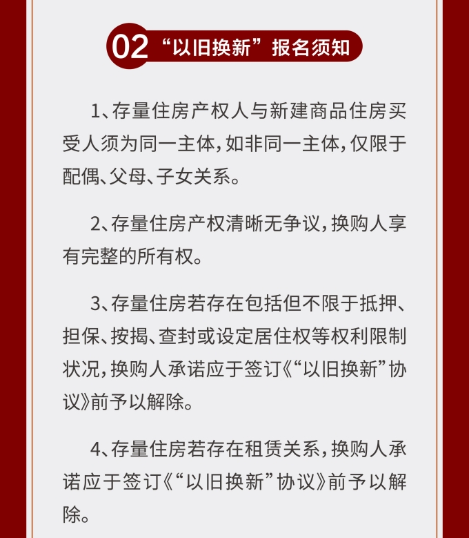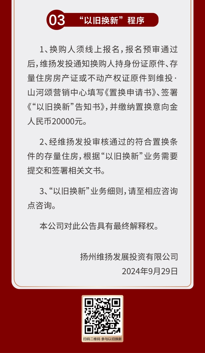 住房“以舊換新”“以房換房”是各地房地產(chǎn)新政中以“小細(xì)節(jié)”撬動“大市場”的重要舉措。維揚(yáng)發(fā)投積極響應(yīng)政府新推行的“以舊換新”政策,踐行“惠民”理念,整合各項(xiàng)資源,搭建換房中心平臺,為買房人提供一站式以舊換新置換服務(wù),推動激活邗江區(qū)商品房市場活力。 此次維揚(yáng)發(fā)投“以舊換新”工作以其自主開發(fā)的維投·山河頌項(xiàng)目為試點(diǎn),由國企背書、置換范圍廣、全流程專業(yè)服務(wù)。首批換購新建商品住房限額50套,換購人可通過登錄“維揚(yáng)發(fā)投商品住房‘以舊換新’線上報(bào)名系統(tǒng)”報(bào)名,具體要求詳見公告。