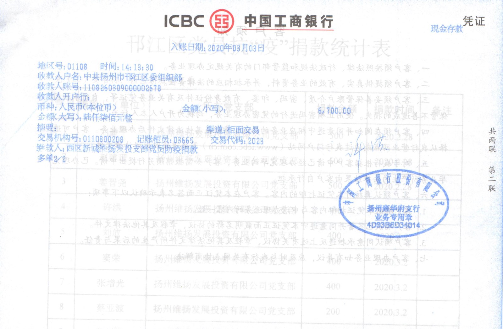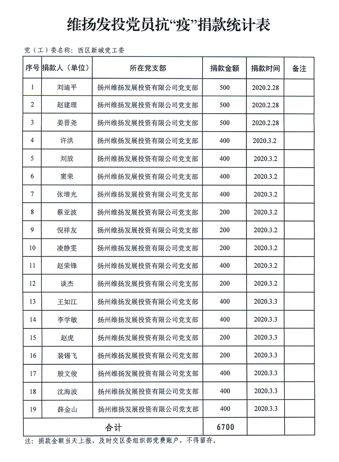 涓流不吝,以成江河。截止目前,公司黨支部一共向邗江區(qū)委組織部賬戶匯入黨員抗疫特殊黨費(fèi)6700元。公司員工及合作單位也籌集了13400元的抗疫愛(ài)心捐款,匯款至邗江區(qū)紅十字會(huì)。